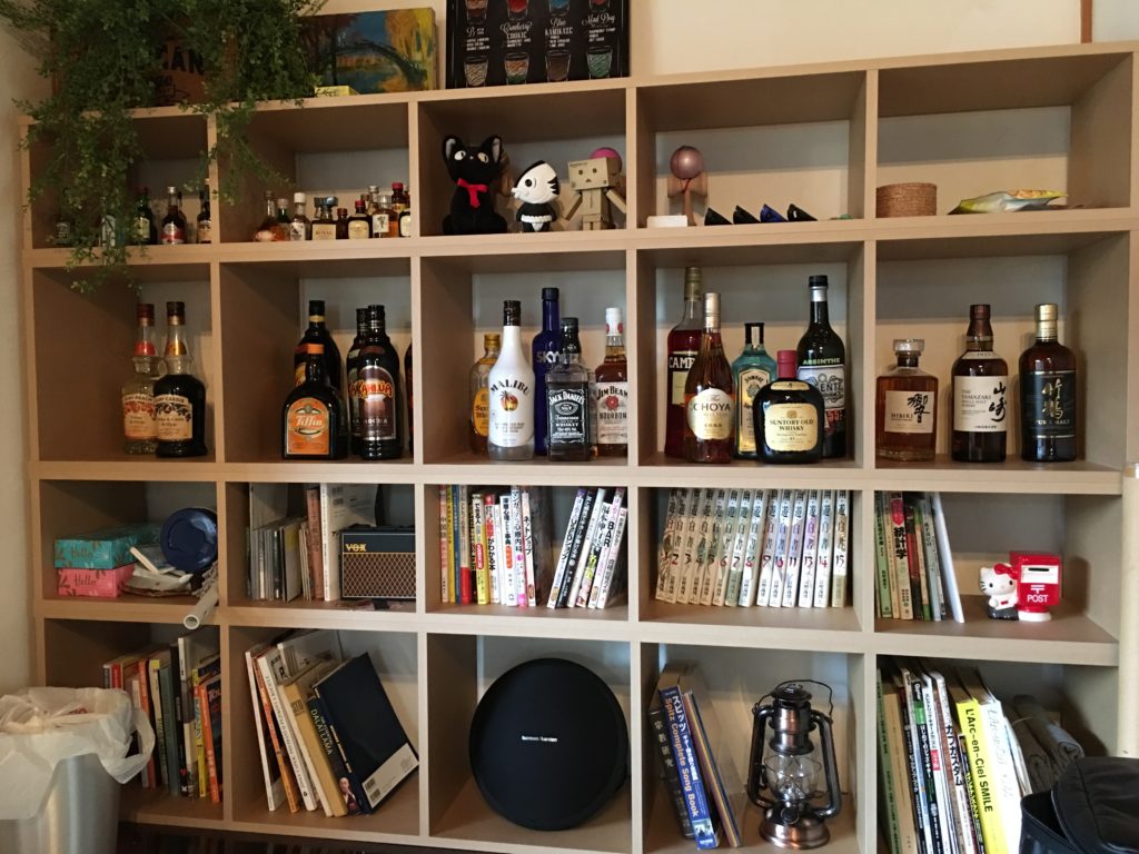 本棚だけど本以外の物がたくさん置かれてます。みんながお土産なんかを置いていったりもしてくれます。