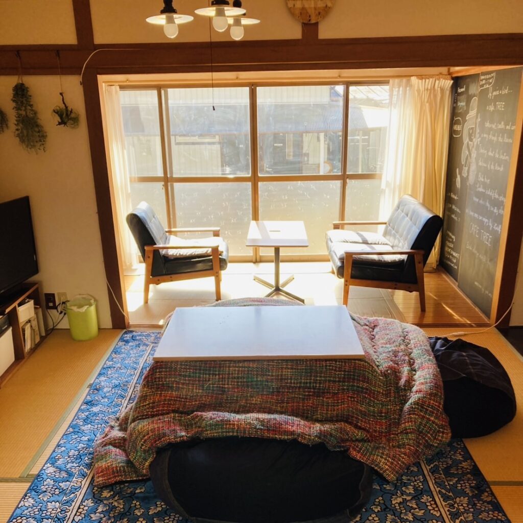 シェアハウスの中で最も明るい場所。キッチンと繋がっているので、住民はここで食事をすることが多いです。ちょっとしたお茶や作業にも使えるスペースです。